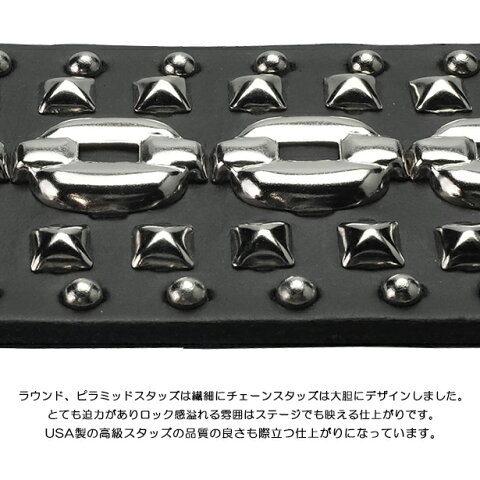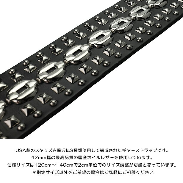 ■商品仕様 【生産国】日本 【素材】牛革・スタッズ/真鍮 【サイズ】革幅/42mm・長さ/120cm〜140cm 【掲載写真の仕様】本体/ブラック・金具/シルバー ■特徴 ベースレザーは国産の高級オイル革を使用しています。