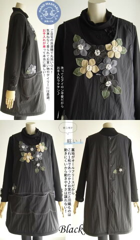 【日本製・洗える】おうち時間を楽しもう♪ エプロン かわいい ナイロン カッポー おしゃれ おしゃれなエプロン 大きいサイズ エプロン 紺 黒 赤 エプロンおとぎ フリル お花//【ベルパーチ】デニム花ライナー付チュニックエプロン