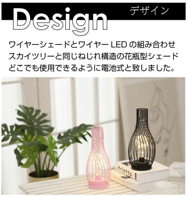 品番 HA-JLB 商品名 ジュエリーランプ Bタイプ 電池別売 全2色 カラー ブラック / ピンク ワイヤーLED LED:14pcs カラー:ゴールド サイズ ラウンドタイプ:トップ直径 53 × 最大直径 135 × ベース直径 100 × 高さ 290mm 材質 ワイヤーシェード/ベース:スチール 電球ボトル:軟質プラ 電池ボックス:PP 重量 約 415g 電源 単3電池×3本(別売) 注意事項 ※デザインは予告なく変更となる場合がございますのでご了承ください。
