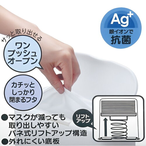・かわいい&おしゃれなデザイン全15種 ・普通サイズの不織布マスクを約50枚、たっぷり収納 ・サッと取り出せるワンプッシュオープン式、カチッとしっかり閉まるフタ ・バネ式リフトアップ構造で、マスクが少なくなっても取り出しやすい構造 ・子ども用から大人用の大きいサイズまで収納が可能 ・衛生的に安心の抗菌加工 ・玄関や車、店舗など、インテリアに合わせて選べるデザイン ■ラインナップ(全15種) すみっコぐらし ハローキティ&タイニーチャム ミッフィー まいぜんシスターズ ミッキーマウス くまのプーさん SNOOPY/スヌーピー アイム ドラえもん くまのがっこう ボリス スーパーマリオ ポケットモンスター ポッチャマ カビゴン ゲンガー ■サイズ:約横21.8×奥行11.8×高さ13.3cm ■容量:約50枚収納可能 ※普通サイズのマスク ■重さ:約285g ■品質表示(耐熱温度) 本体・受け皿:ポリプロピレン(100度) 底板:ポリエチレン(70度) バネ:ステンレス ■SIAA抗菌加工 SIAAマークはISO22196法により評価された結果に基づき、 抗菌製品技術協議会ガイドラインで 品質管理・情報公開された製品に表示されています。